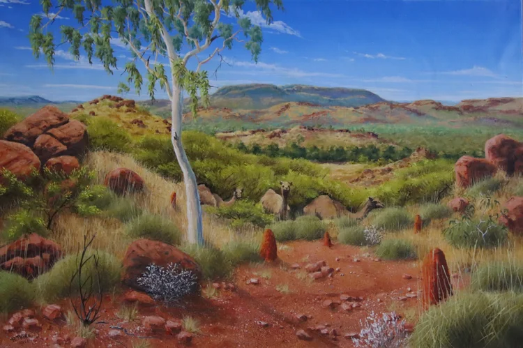 In my Australian landscape paintings, colour is layered gradually to achieve depth and luminosity. Earth tones are carefully balanced with cooler shadows and expansive skies. Each composition is structured to guide the viewer’s eye across the terrain, inviting reflection and connection.